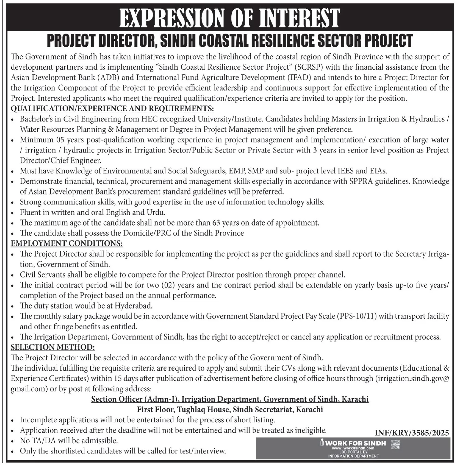 The Government of Sindh has announced a significant opportunity for experienced professionals to lead a critical development initiative: the Sindh Coastal Resilience Sector Project. This project, supported by international partners like the Asian Development Bank (ADB) and the International Fund Agriculture Development (IFAD), aims to improve the livelihood of the coastal region of Sindh province. An “Expression of Interest” has been released, inviting highly qualified and experienced individuals to apply for the prestigious position of Project Director.