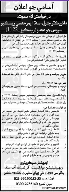 Job Advertisement: Director General Sindh Emergency Rescue Service (Rescue-1122)