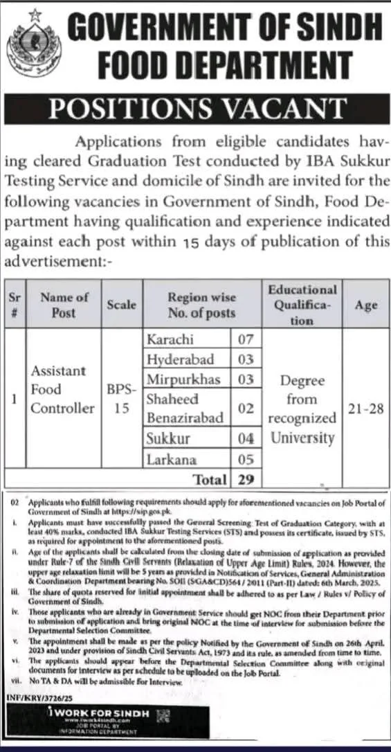 The Government of Sindh Food Department has announced a major recruitment drive for the position of Assistant Food Controller (BPS-15) across multiple regions in Sindh. Applications are invited from eligible candidates who hold a domicile of Sindh and have successfully cleared the mandatory Graduation Test conducted by IBA Sukkur Testing Service.