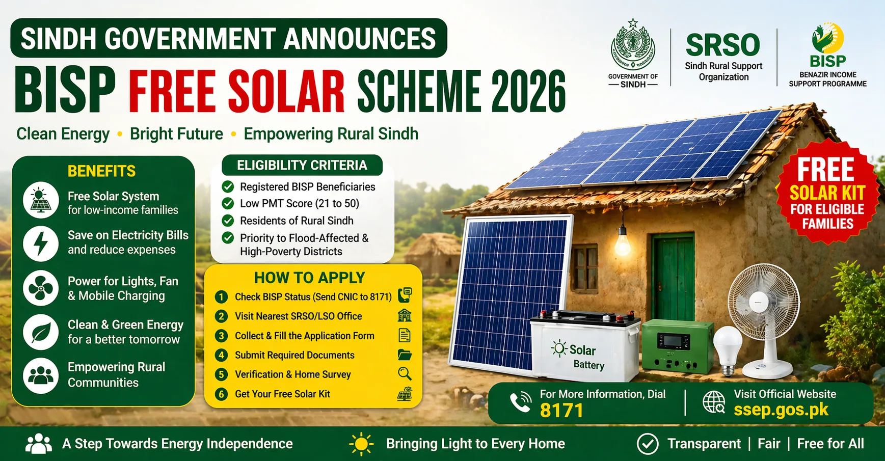 The SRSO-BISP Free Solar Scheme 2026 is part of the broader Sindh Solar Energy Project (SSEP), which focuses on delivering solar home systems to deserving households. The primary goal is to reduce dependence on expensive electricity and provide reliable power solutions in off-grid and underdeveloped areas.