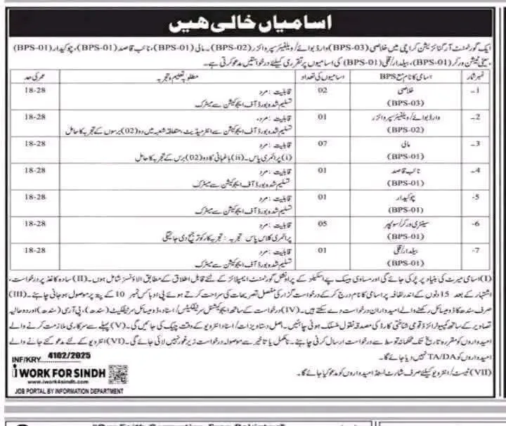 KARACHI, Pakistan – The Government of Sindh has unveiled a significant recruitment drive for various support staff positions (BPS-01 to BPS-03) within a public sector organization. This initiative aims to provide valuable government job opportunities in Sindh for local residents, with positions available on a contract basis. The recruitment drive emphasizes local domicile requirements and targets individuals across numerous districts, reflecting a commitment to local employment and community support.
