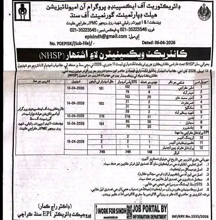 Keywords: Sindh Health Department Jobs 2026, EPI Sindh Vaccinator Interview, STS Sindh Jobs, Government Jobs in Sindh, National Health Support Program NHSP, Karachi Job Alerts, Hyderabad Health Jobs.