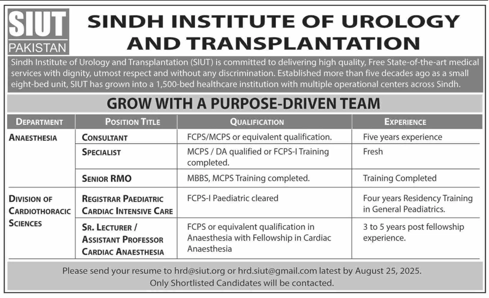 -The Sindh Institute of Urology and Transplantation (SIUT) is seeking to expand its purpose-driven team by invitingd applications for several medical positions. The institute has announced vacancies across its Anaesthesia and Cardiothoracic Sciences departments.