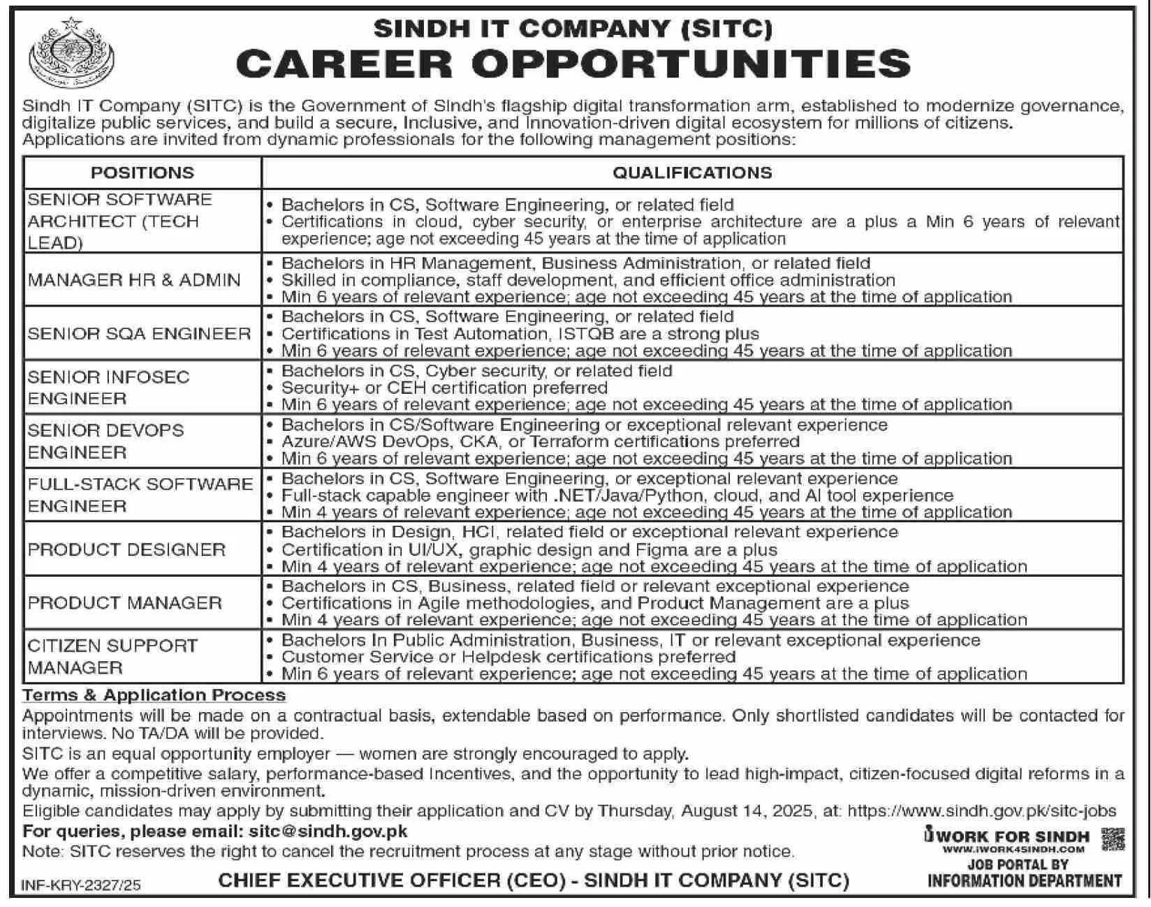 The Sindh IT Company (SITC), the Government of Sindh’s flagship organization for digital transformation, has announced significant career opportunities for dynamic and skilled professionals. Aiming to modernize governance, digitalize public services, and build a secure, inclusive, and innovation-driven digital ecosystem, SITC is inviting applications for several key management positions. This is a unique opportunity to lead high-impact, citizen-focused digital reforms in a dynamic environment.