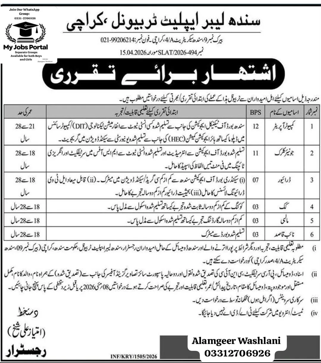 The Sindh Labour Appellate Tribunal, Karachi, has officially announced new job opportunities for the year 2026. This recruitment drive is aimed at filling various administrative and support staff positions. If you are a resident of Sindh and looking for government employment, this is an excellent opportunity to apply.