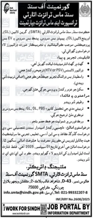 The Government of Sindh’s Mass Transit Authority (SMTA) is inviting applications from qualified women for driver positions across its major public transport projects in Karachi. This initiative is part of a broader effort to empower women and ensure safer travel for female passengers on services like the Pink Bus, Peoples Bus Service, Green Line, and Orange Line.