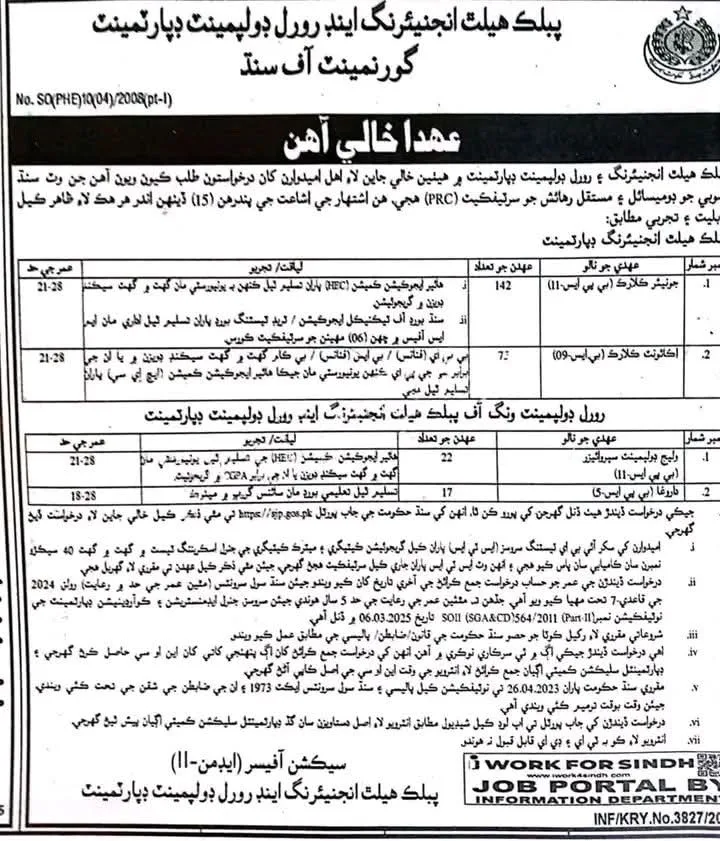 The Government of Sindh, Public Health Engineering and Rural Development Department, is inviting applications from eligible candidates who hold a Permanent Residence Certificate (PRC) and Domicile of Sindh. This major recruitment drive aims to fill a large number of vacant positions across both the Public Health Engineering and Rural Development Wings of the department.