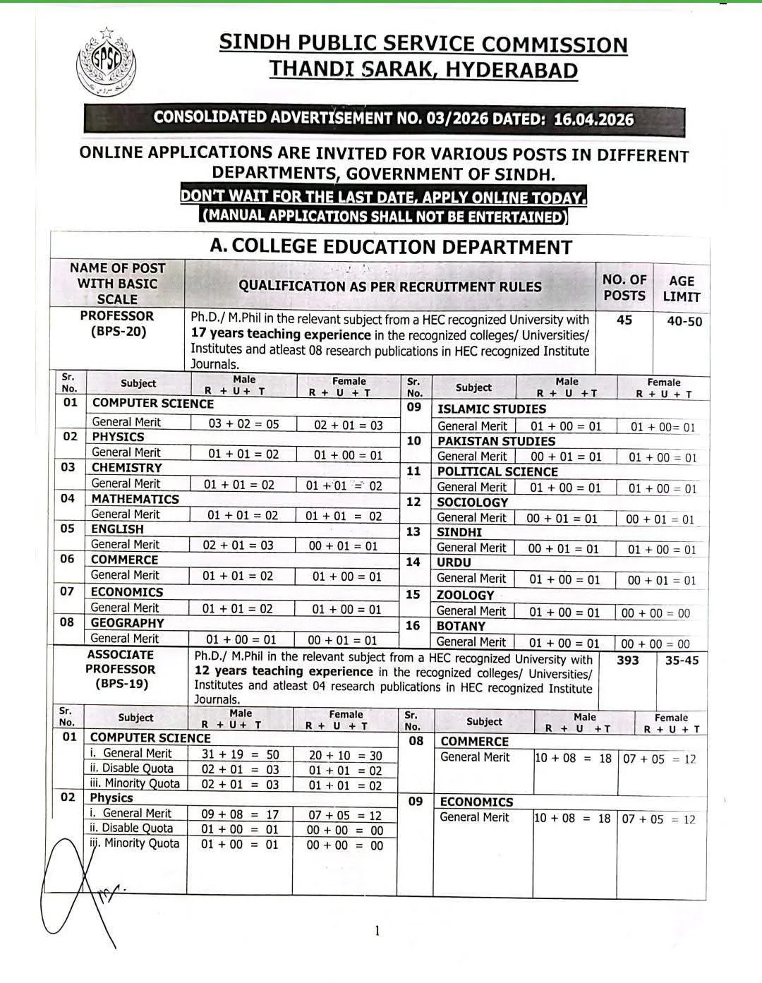 The Sindh Public Service Commission (SPSC) has officially released Consolidated Advertisement No. 03/2026, opening doors for over 1,300 high-level career opportunities in various provincial departments. This is a significant recruitment drive for experienced educators, medical professionals, and social scientists.