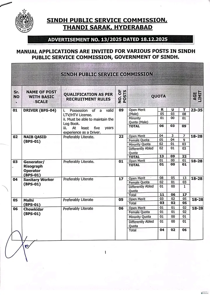 The Sindh Public Service Commission (SPSC) has officially released Advertisement No. 13/2025, opening doors for various manual job opportunities in 2026. This recruitment drive targets multiple support staff roles within the Government of Sindh, providing a pathway for dedicated individuals to secure permanent positions in the public sector.