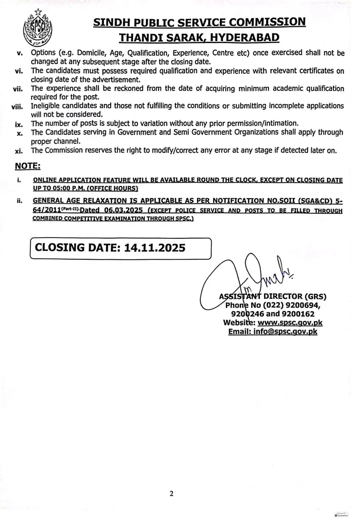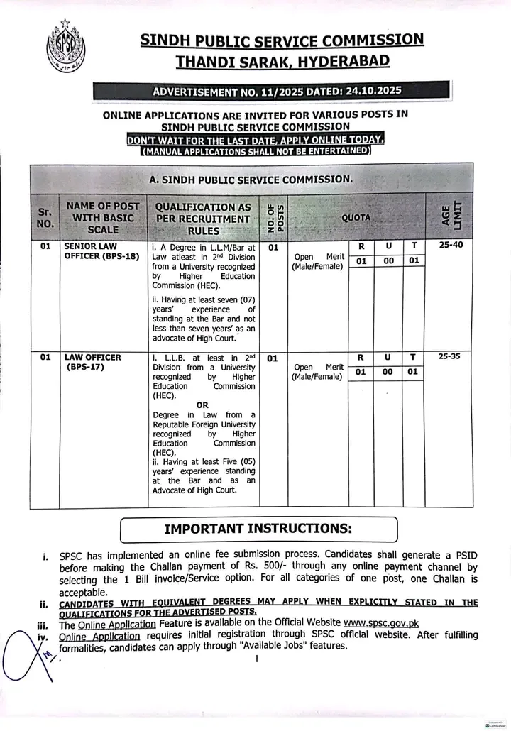 This is a significant career opportunity for experienced legal professionals to join the provincial civil service and work with a key constitutional body. The SPSC has emphasized that manual applications will not be entertained, and all candidates must apply online. The closing date for applications is November 14, 2025.
