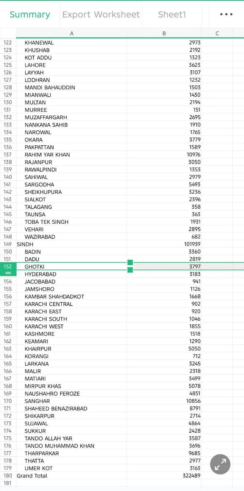 A: Yes, the specific section of the spreadsheet totaling 101,939 refers only to the districts within the Sindh province.