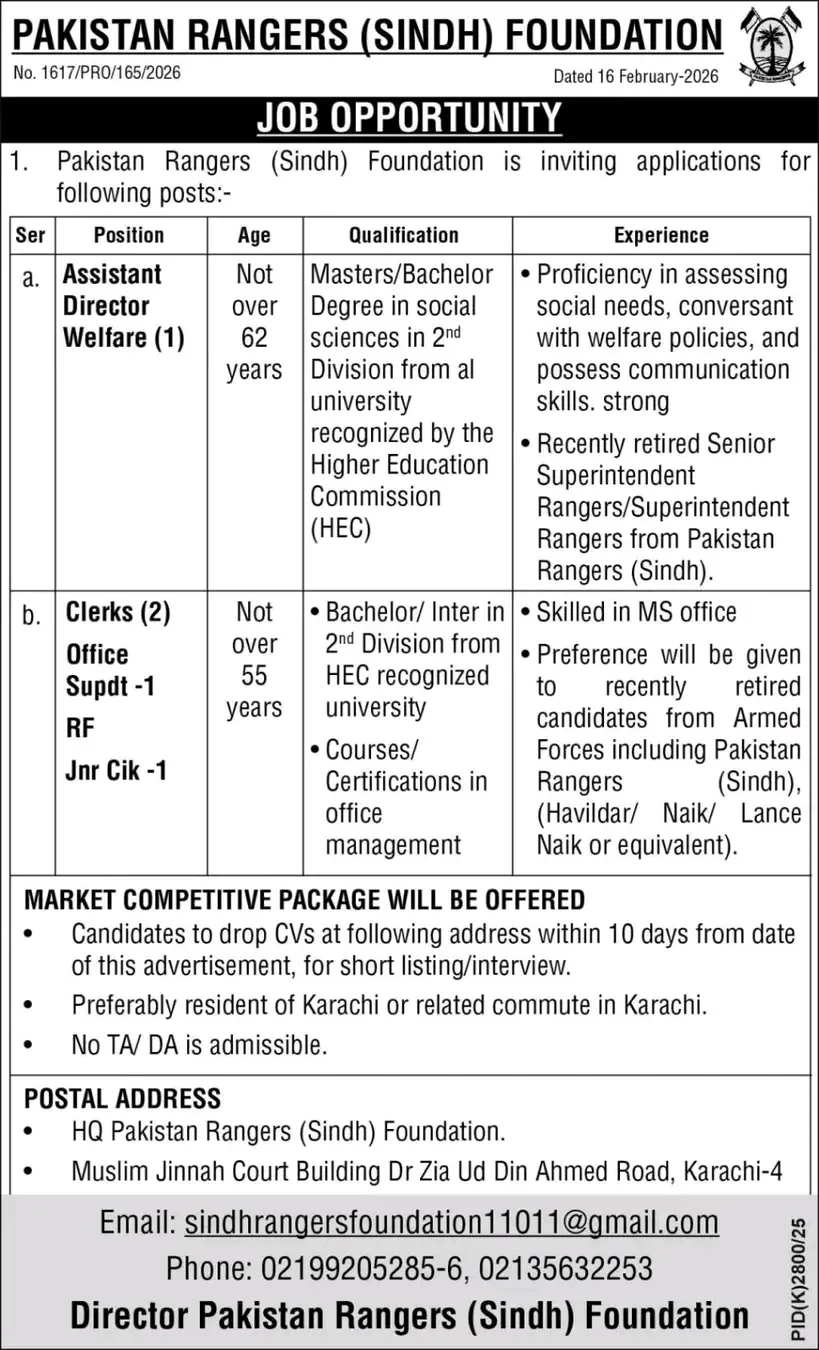 The Pakistan Rangers (Sindh) Foundation has officially announced new job openings for its administrative wing. These positions are designed for dedicated individuals, with a strong preference given to recently retired personnel from the Pakistan Rangers (Sindh) and the Pakistan Armed Forces.