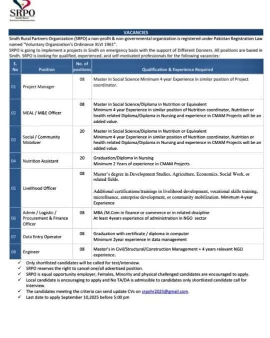 The Sindh Rural Partners Organization (SRPO), a non-profit and non-governmental organization, has announced a major recruitment drive for a series of projects being implemented in Sindh on an emergency basis. With the support of various donors, SRPO is seeking qualified, experienced, and self-motivated professionals to fill a wide range of vacancies across multiple disciplines. All positions are based in Sindh.