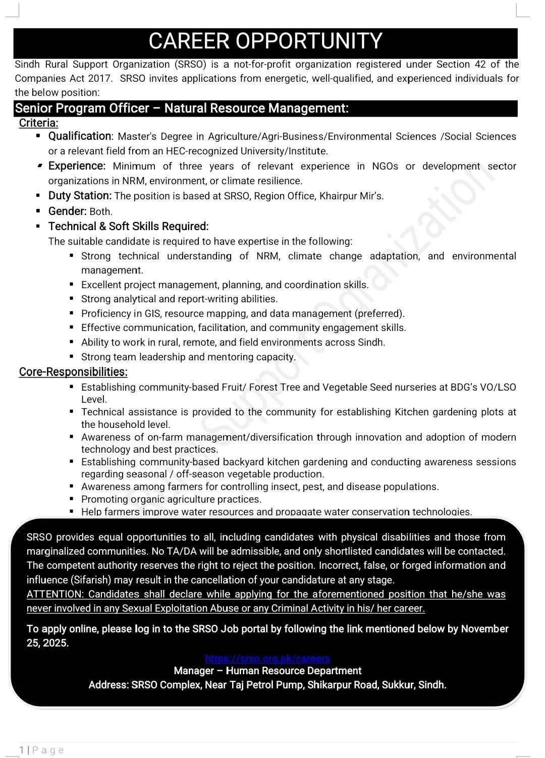 The Sindh Rural Support Organization (SRSO), a leading not-for-profit development organization registered under Section 42 of the Companies Act 2017, is inviting applications for a key leadership role in its natural resource management programs. SRSO is seeking an energetic, well-qualified, and experienced individual for the position of Senior Program Officer – Natural Resource Management.