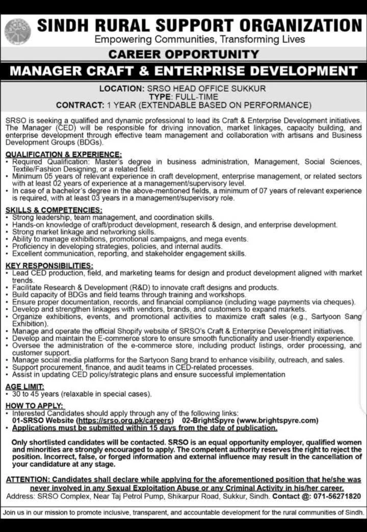 The Sindh Rural Support Organization (SRSO), a leading non-profit dedicated to empowering communities and transforming lives, has announced a key career opportunity for a Manager of Craft & Enterprise Development. SRSO is seeking a qualified, dynamic, and experienced professional to lead its innovative Craft & Enterprise Development (CED) initiatives from its Head Office in Sukkur.