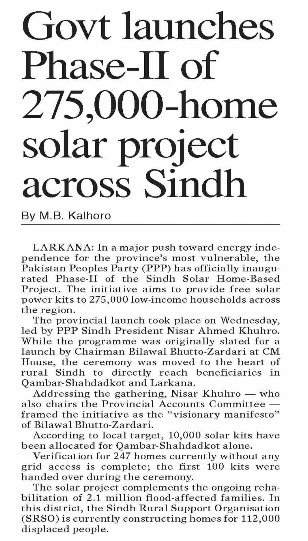 Primary Keywords: Sindh Solar Project Phase II, Free Solar Kits Sindh, 275,000 Solar Homes Project, Nisar Khuhro Solar Launch, Larkana Solar Distribution.