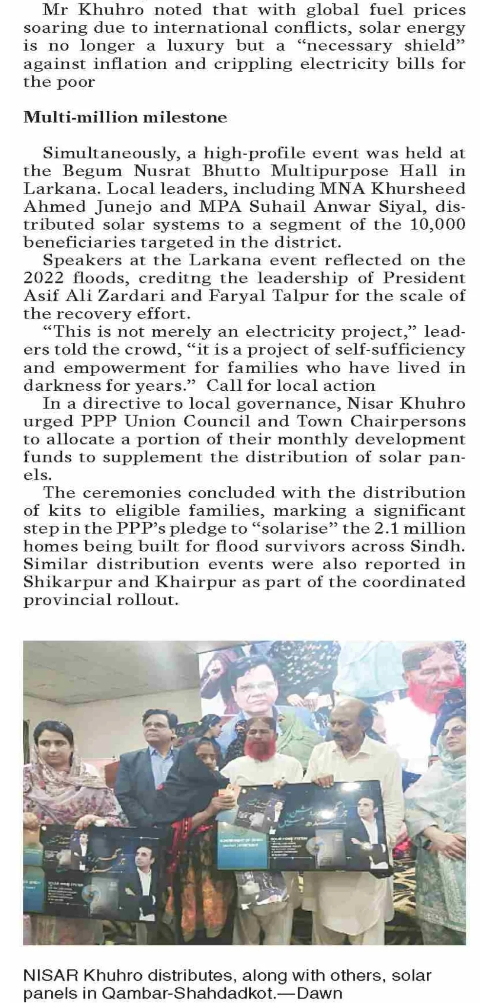 Addressing a large gathering at the launch, PPP Sindh President Nisar Ahmed Khuhro emphasized that in an era of soaring global fuel prices and economic instability, solar energy is no longer a luxury for the elite but a “necessary necessity” for the poor.