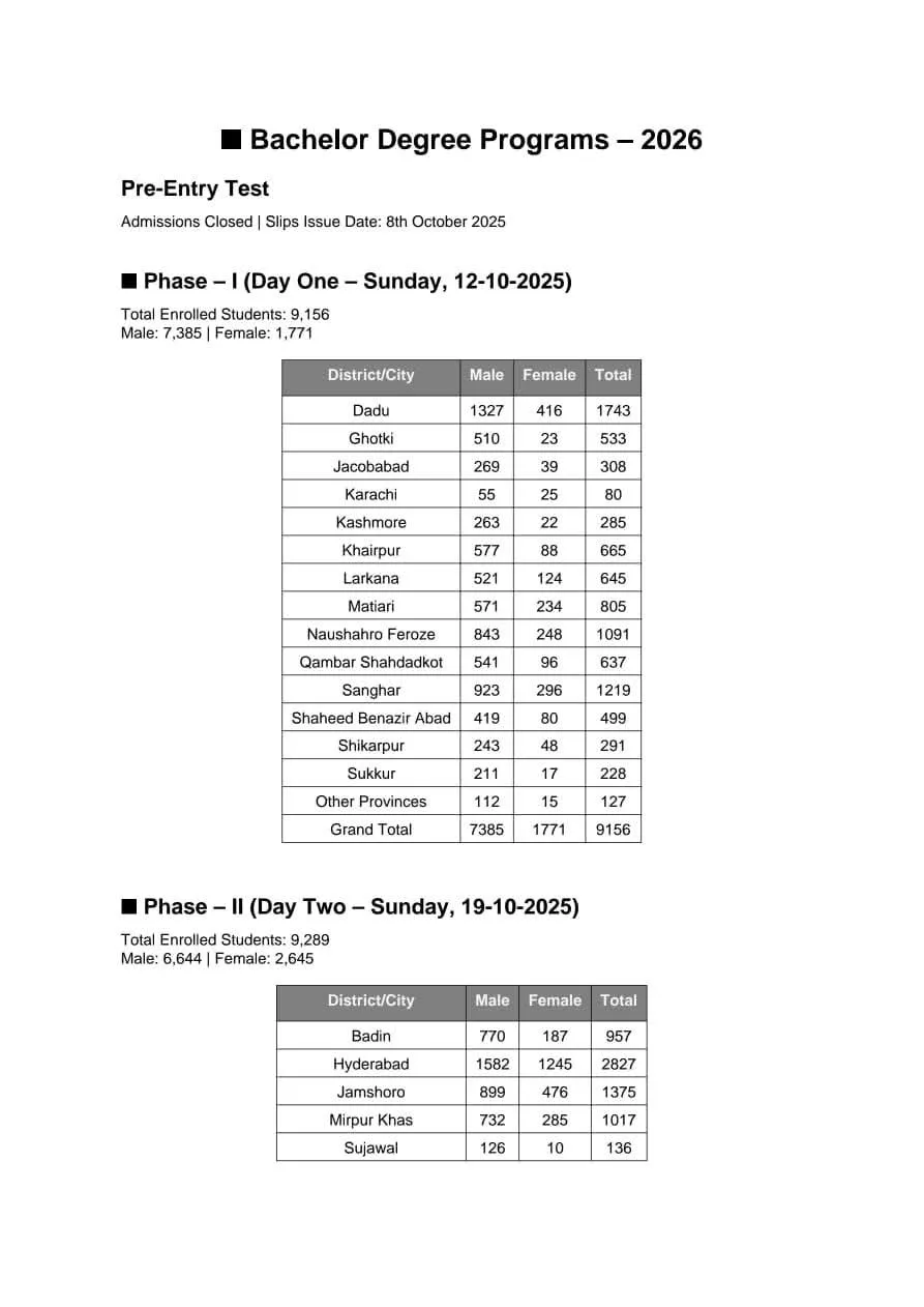 The first phase of the pre-entry test is scheduled for Sunday, October 12, 2025. A total of 9,156 students are enrolled to appear on this day, comprising 7,385 male and 1,771 female candidates.