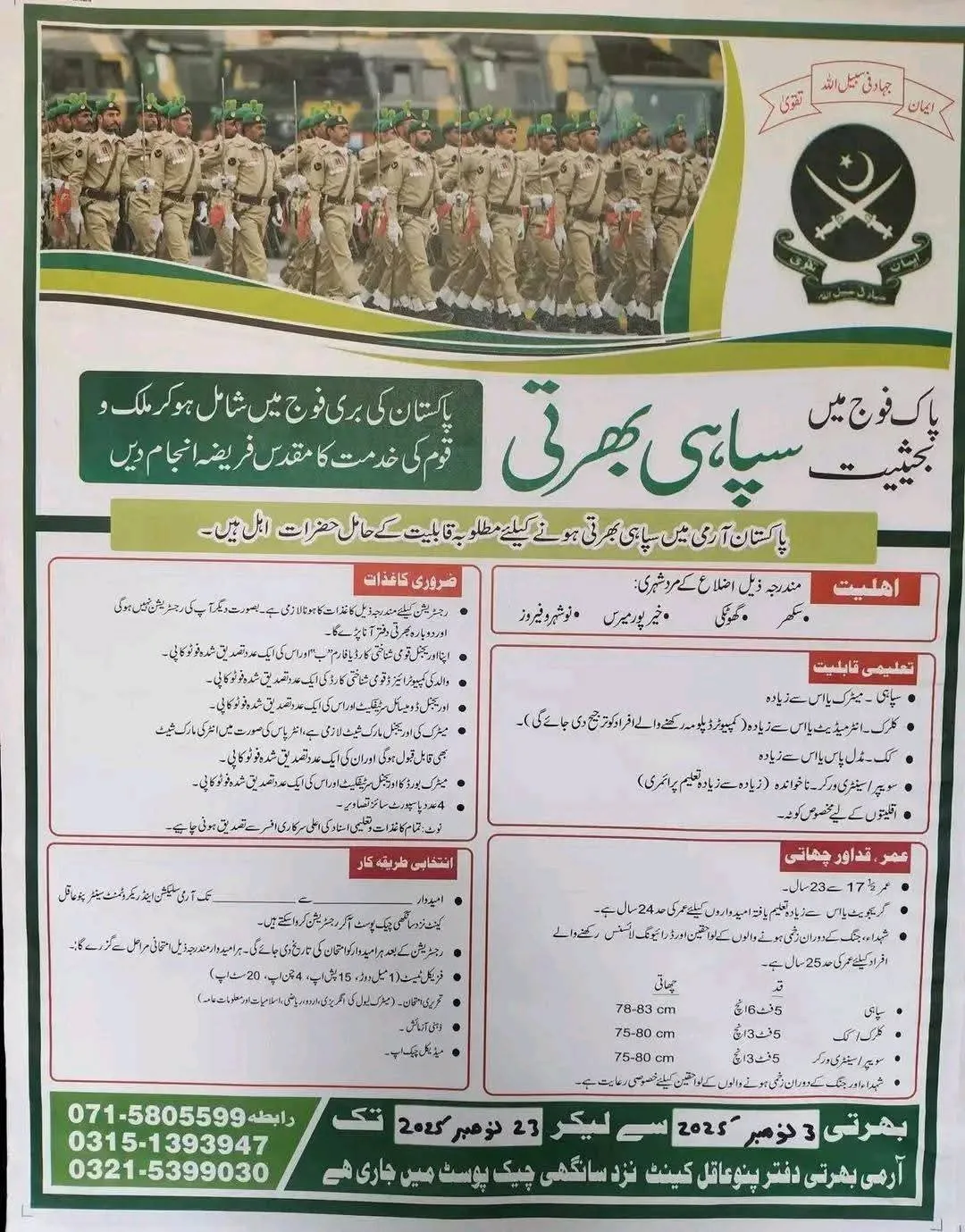 The Pakistan Army, a prestigious and respected institution, is once again opening its doors to patriotic and dedicated young individuals to serve the nation. This recruitment drive, known as “Sipahi Bharti,” offers an incredible opportunity to join the ranks as a soldier (Sipahi) and contribute to the country’s defense and security. If you are physically fit, possess the required educational qualifications, and have an unwavering spirit of service, this is your chance to embark on a fulfilling and honorable career.