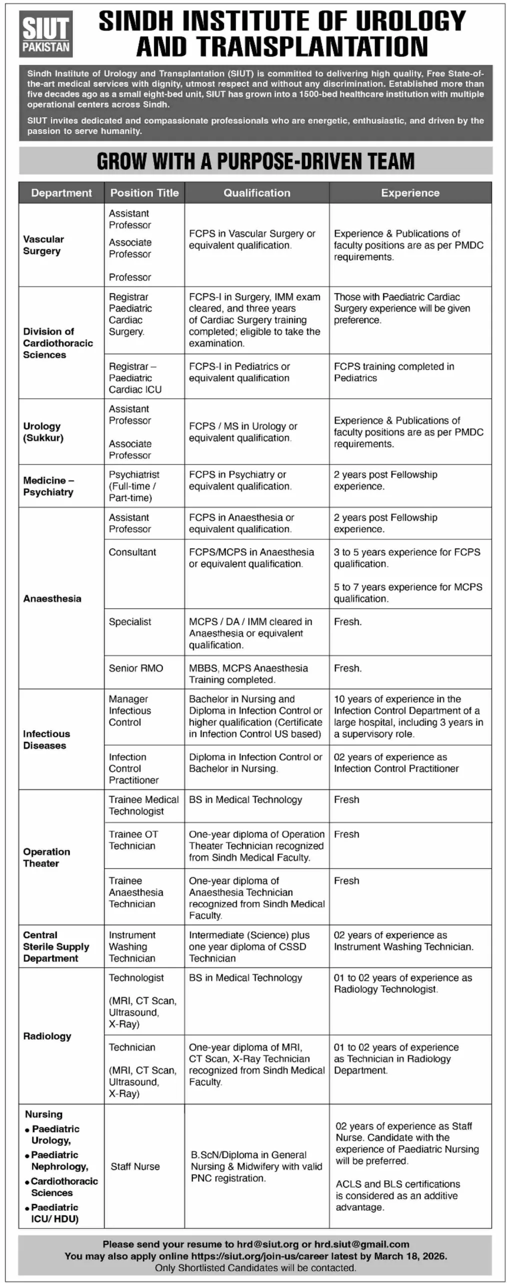 • Trainee Anaesthesia Technician: One-year diploma recognized by Sindh Medical Faculty (Fresh).
