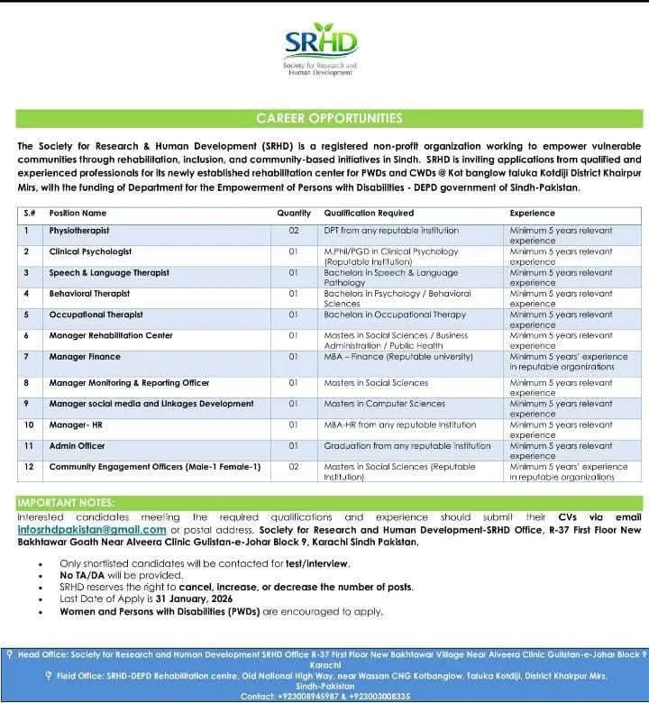 In a significant move toward social inclusion and the empowerment of marginalized groups, the Society for Research & Human Development (SRHD) has announced a major recruitment drive. This initiative is centered around its newly established rehabilitation center for Persons with Disabilities (PWDs) and Children with Disabilities (CWDs) located in Kot banglow, Taluka Kotdiji, District Khairpur Mirs.
