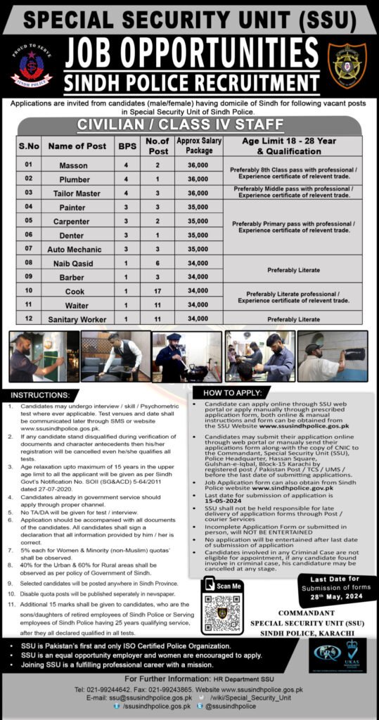 Are you ready to serve your community and make a meaningful impact? Special Security Unit (SSU) of Sindh Police is offering exciting job opportunities for candidates domiciled in Sindh. As Pakistan’s first and only ISO Certified Police Organization, SSU prides itself on its commitment to excellence and professionalism. Join us in our mission to safeguard the citizens of Sindh and ensure peace and security across the province.
