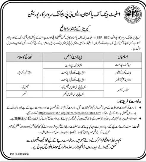The State Bank of Pakistan Banking Services Corporation (SBP BSC), a wholly-owned subsidiary of the State Bank of Pakistan (SBP), has officially opened applications for several key positions. SBP BSC acts as the principal operational arm of the central bank, managing critical functions through its 16 field offices nationwide.