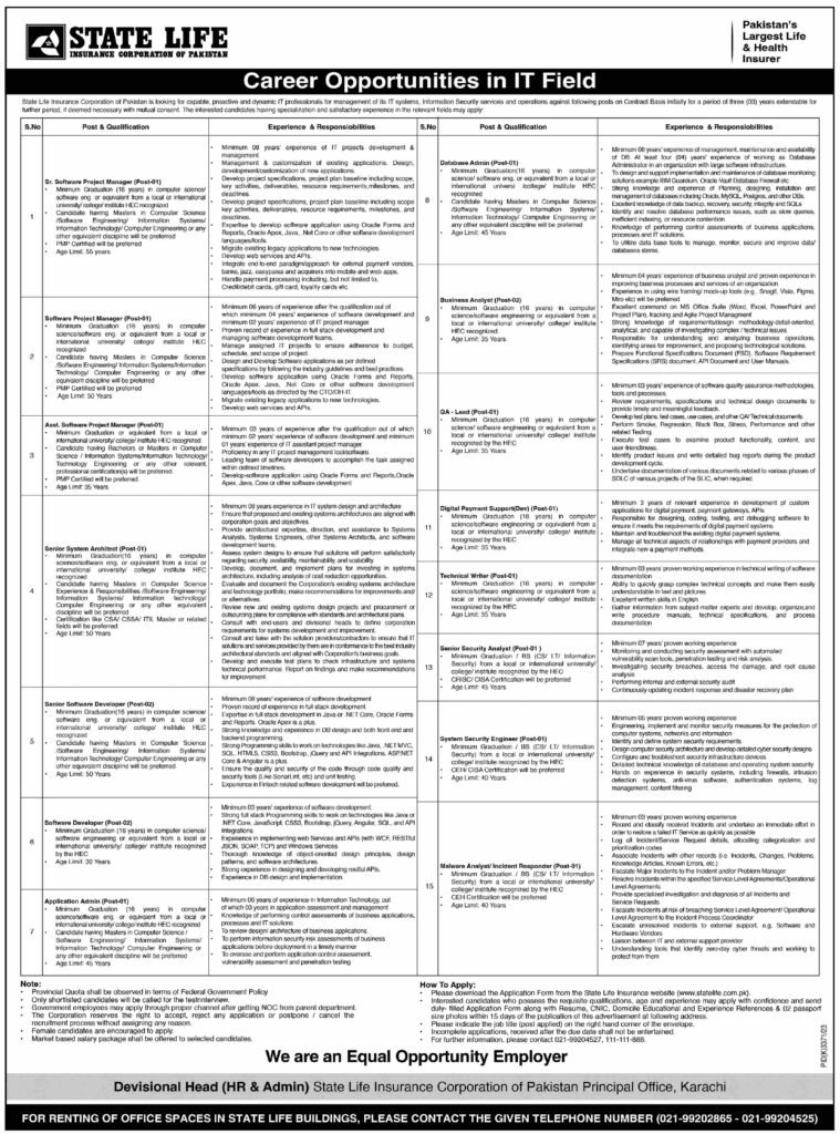 Note: Incomplete applications or those received after the due date will not be entertained. Market-based salary packages will be offered to selected candidates. State Life Insurance Corporation of Pakistan is an equal opportunity employer. Female candidates are encouraged to apply.For further information, contact 021-99204527, 111-111-888.