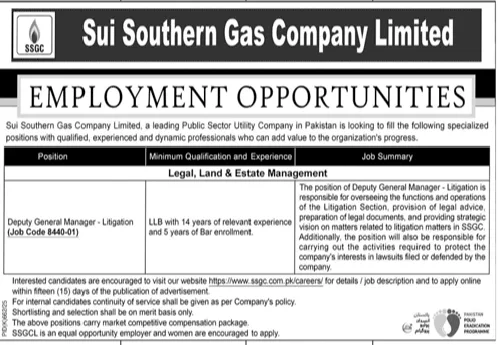 Pakistan – Sui Southern Gas Company Limited (SSGC), a leading public sector utility company in Pakistan, is seeking a qualified, experienced, and dynamic professional to fill a key specialized position within its legal department. SSGC is looking for an individual who can add significant value to the organization’s progress.