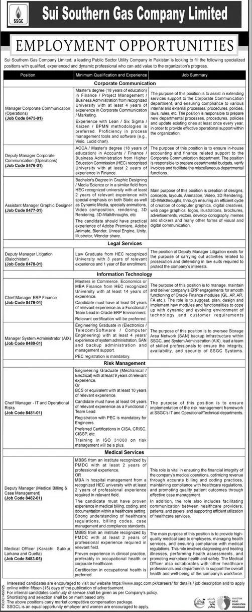 Sui Southern Gas Company Limited (SSGC), a leading Public Sector Utility Company in Pakistan, has announced a major recruitment drive, seeking qualified, experienced, and dynamic professionals to fill a wide range of specialized positions. This is a significant opportunity for individuals to join a cornerstone of Pakistan’s energy sector and contribute to the organization’s progress and success. SSGC is offering roles across diverse departments including Corporate Communication, Legal Services, Information Technology, Risk Management, and Medical Services.