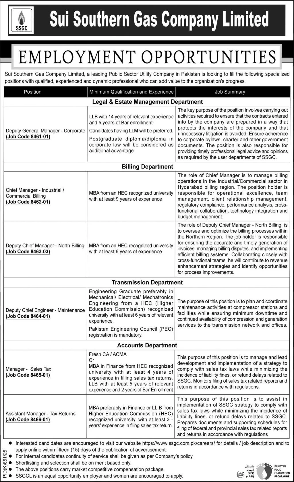 SSGC is seeking to fill senior and mid-level management roles across its Legal, Billing, Transmission, and Accounts departments.