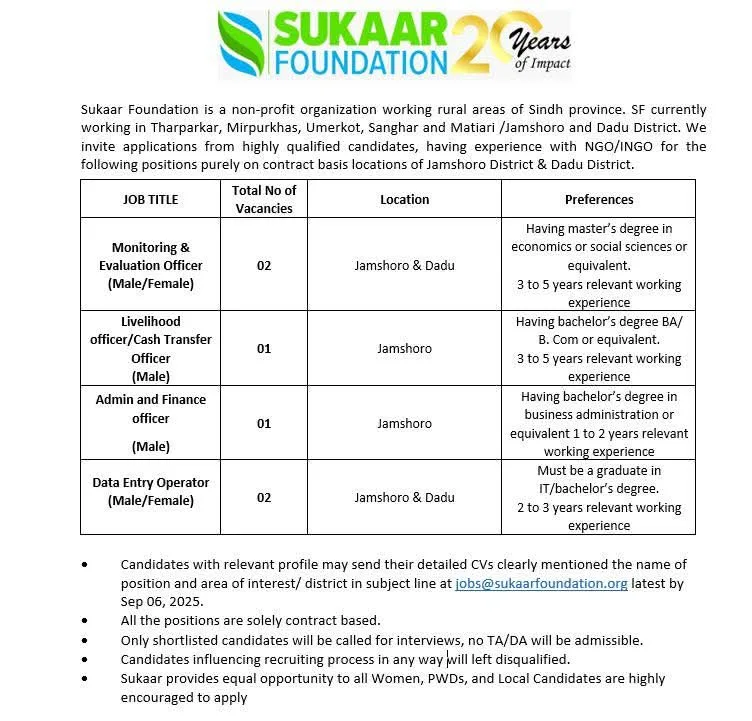 Sukaar Foundation, a non-profit organization dedicated to working in the rural areas of Sindh, has announced several job openings for its project locations in Jamshoro and Dadu districts. Celebrating 20 years of impact, the foundation invites applications from highly qualified and experienced candidates for multiple contract-based positions. This is a prime opportunity for individuals with a background in the NGO/INGO sector to contribute to meaningful projects in districts such as Tharparkar, Mirpurkhas, Umerkot, Sanghar, and Matiari.