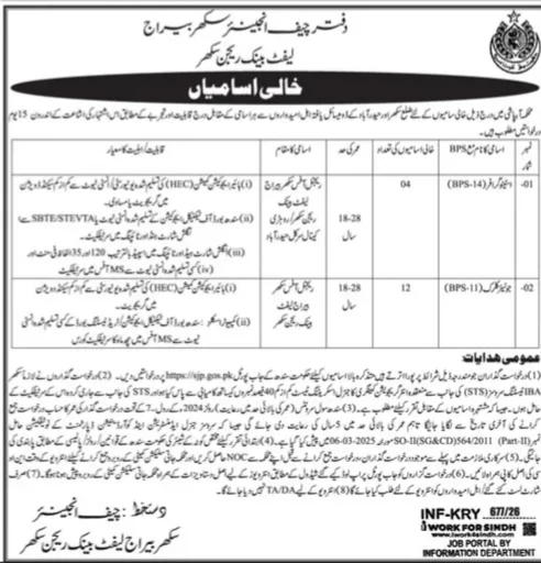 For further details, candidates can visit the office of the Chief Engineer, Sukkur Barrage Left Bank Region, Sukkur.