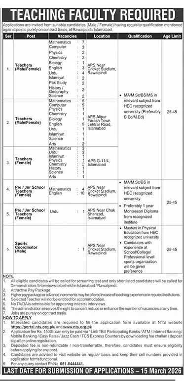 Under the category of Teachers (Male/Female) Jobs 2026, the institution is hiring subject specialists for various disciplines at campuses near APS and Cricket Stadium Rawalpindi.