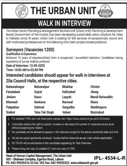The Urban Unit Announces Massive Walk-in Interviews for 1200 Surveyor Positions Across Punjab