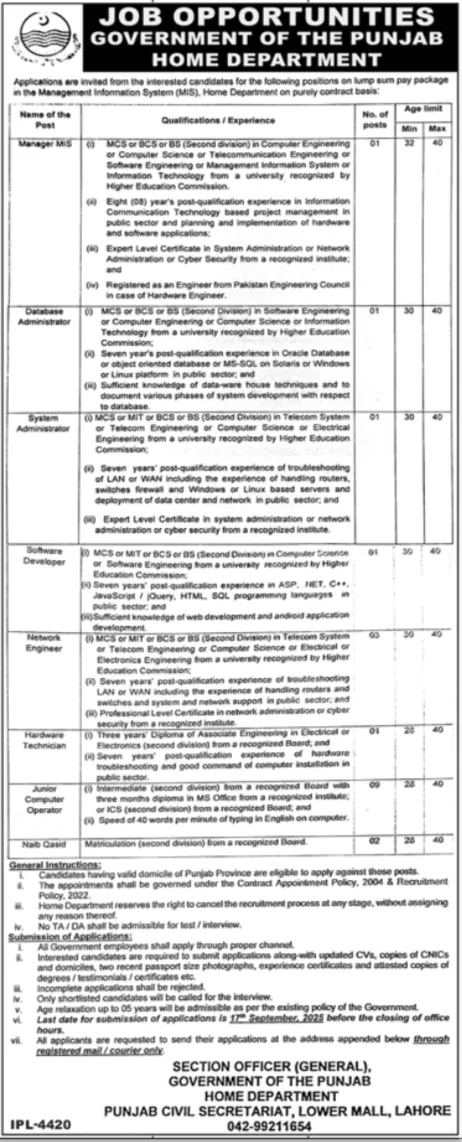 Applications are invited from interested candidates for various positions on a lump sum pay package in the Management Information System (MIS), Home Department, Punjab on a purely contract basis.