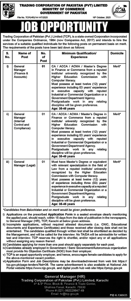The Trading Corporation of Pakistan (Pvt.) Limited (TCP), a state-owned corporation under the Ministry of Commerce, has invited applications from suitable qualified individuals for several senior management positions. TCP is looking to hire professionals on a permanent basis on merit for the following General Manager roles.