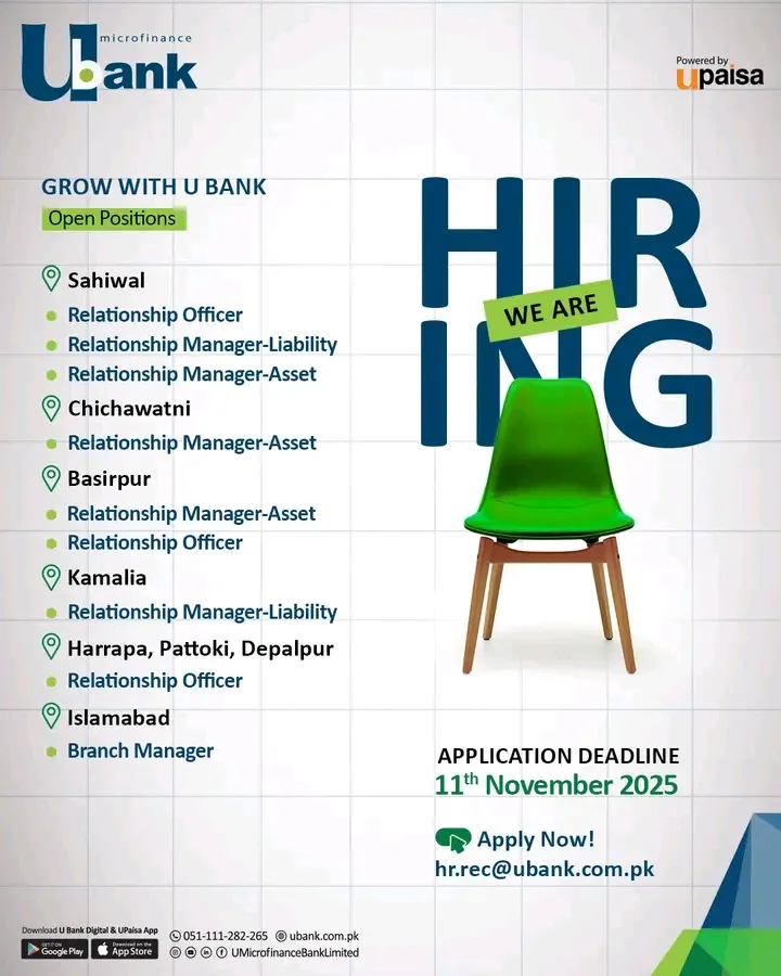 With a strong focus on innovation, inclusion, and customer-centric services, U Bank continues to expand its footprint across urban and rural areas of Pakistan. The U Bank Jobs 2025 initiative reflects the bank’s commitment to attracting qualified professionals to join its mission of transforming lives through financial inclusion.