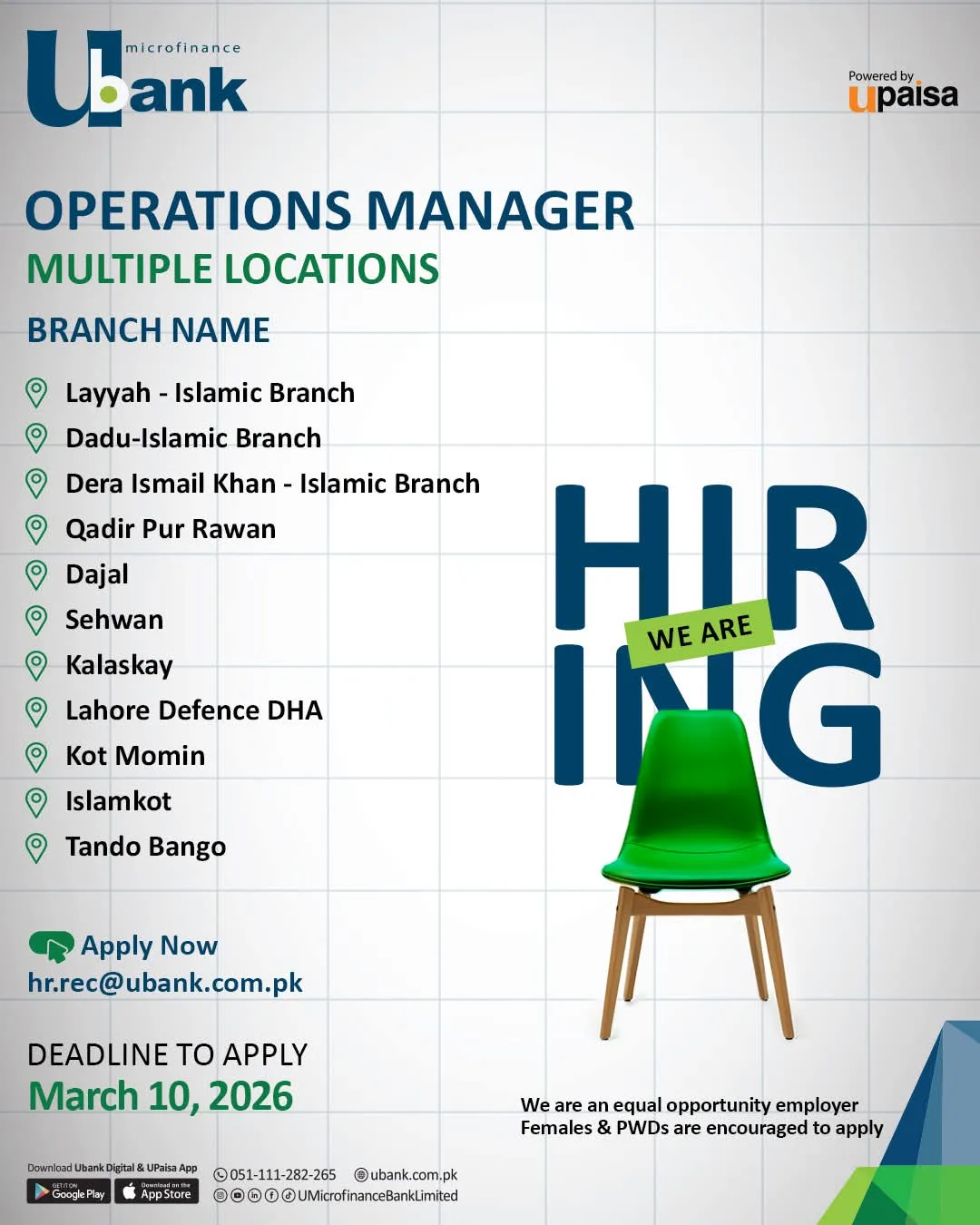 U Microfinance Bank (U Bank), powered by UPaisa, has officially announced exciting career opportunities for the position of Operations Manager at multiple branch locations across Pakistan.This recruitment drive for 2026 is a golden chance for banking professionals to join one of the fastest-growing microfinance institutions in the country.