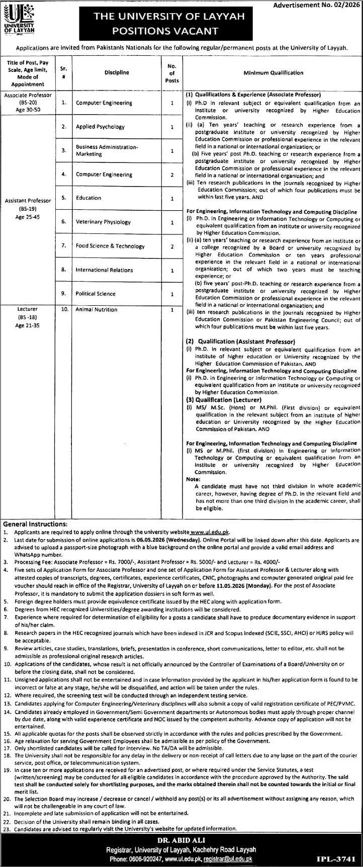 Keywords: University of Layyah Jobs 2026, Academic Careers Pakistan, Lecturer Jobs Punjab, Assistant Professor Vacancies, HEC Eligibility 2026, UL Online Portal, Veterinary Faculty Jobs, Computer Engineering Professor Vacancies.