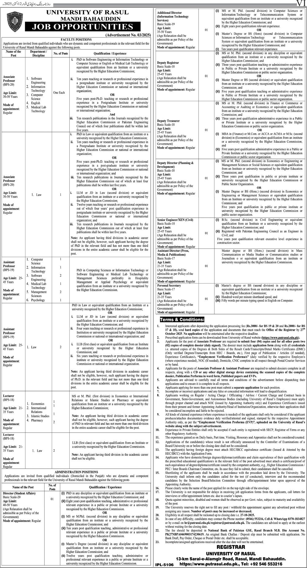 The University of Rasul, Mandi Bahauddin, has invited applications from dynamic, competent, and professional individuals for a wide range of faculty and administrative positions. This extensive recruitment drive, detailed in Advertisement No. 03/2025, is a significant opportunity for academics and administrators to join a growing public sector university.