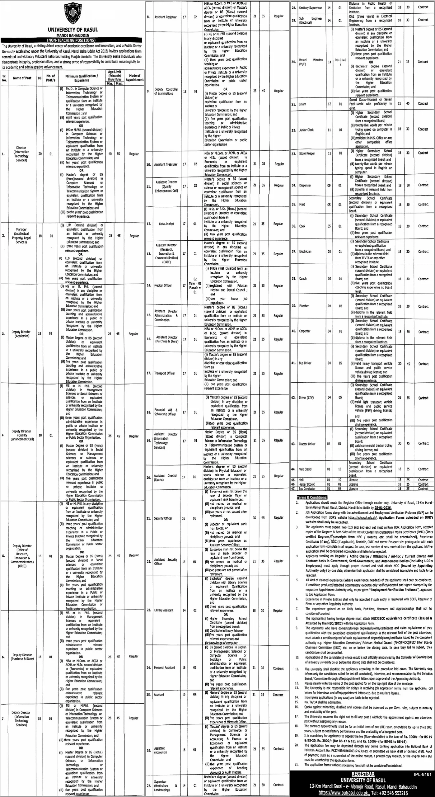 The University of Rasul, located at 13-Km Mandi Bahauddin – Sarai Alamgir Road, is inviting applications from Pakistani nationals for the following Non-Teaching Positions. Appointments will be made strictly under university statutes and government rules.